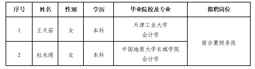 因公司發(fā)展需要,承德市建設(shè)投資有限責(zé)任公司委托第三方機(jī)構(gòu)面向社會(huì)公開招聘前臺(tái)兼財(cái)務(wù)崗員工?,F(xiàn)對(duì)擬錄用人員信息進(jìn)行公示,公示期間如有異議,可通過電話、信函等方式反映,反映意見請(qǐng)署真實(shí)姓名。